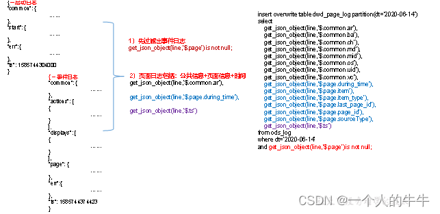 页面日志解析思路:页面日志表中每行数据对应一个页面访问记录,一个页面访问记录应该包含日志中的公共信息和页面信息。先将所有包含page字段的日志过滤出来,然后使用get_json_object函数解析每个字段。