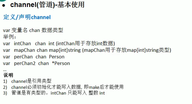 - 方式二:这里就引出了channel(管道)顾名思义就是一个管子,把同类型的资源例如sting类型的放入一个管道中,channel是在多个goroutine协程之间传递数据和同步的重要手段,channel是一个引用类型,是带tag所以遵循先入先出原则(个人猜测)