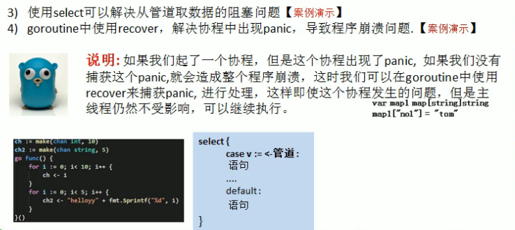 - 在goroutine中使用defer+recover()+匿名函数进行异常捕获即使这个goroutine发生了panic也不会影响主线程运行