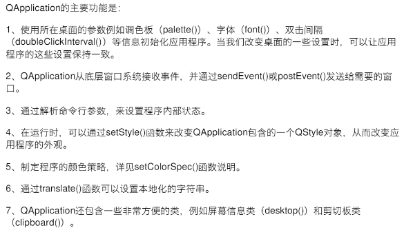 QApplication负责管理GUI程序的控制流和主要设置。其包含窗口系统和其他来源处理过和发送过的主要事件循环。它也处理应用程序的初始化和首位工作,并提供对话管理。QApplication可以对系统和应用的大部分设置项进行设置。