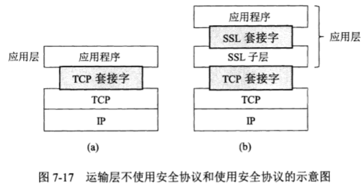 使用SSL后,因为SSL增加了TCP的服务(更加安全了),因此SSL应该是运输层协议。然而实际上,需要使用安全运输的应用程序(如HTTP)却把SSL驻留在应用层。如上图所示,应用层扩大了。在应用层序下面多了一个SSL子层,而在应用程序和SSL子层之间,还有一个SSL套接字,其作用和TCP套接字相似,是应用程序和SSL子层的应用编程接口API。