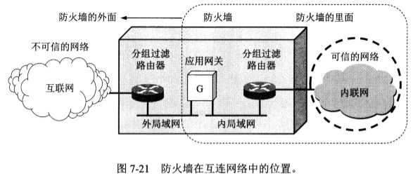 :是一种具有分组过滤功能的路由器,它根据过滤规则对进出内部网络的分组执行转发或者丢弃(即过滤)。过滤规则是基于分组的网络层或运输层首部的信息,例如:源/目的IP地址、源/目的端口、协议类型(TCP或UDP)等等。