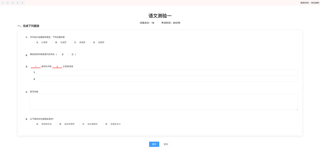 考试,题干支持文本、图片、数学公式、表格等,学生答题支持:文本