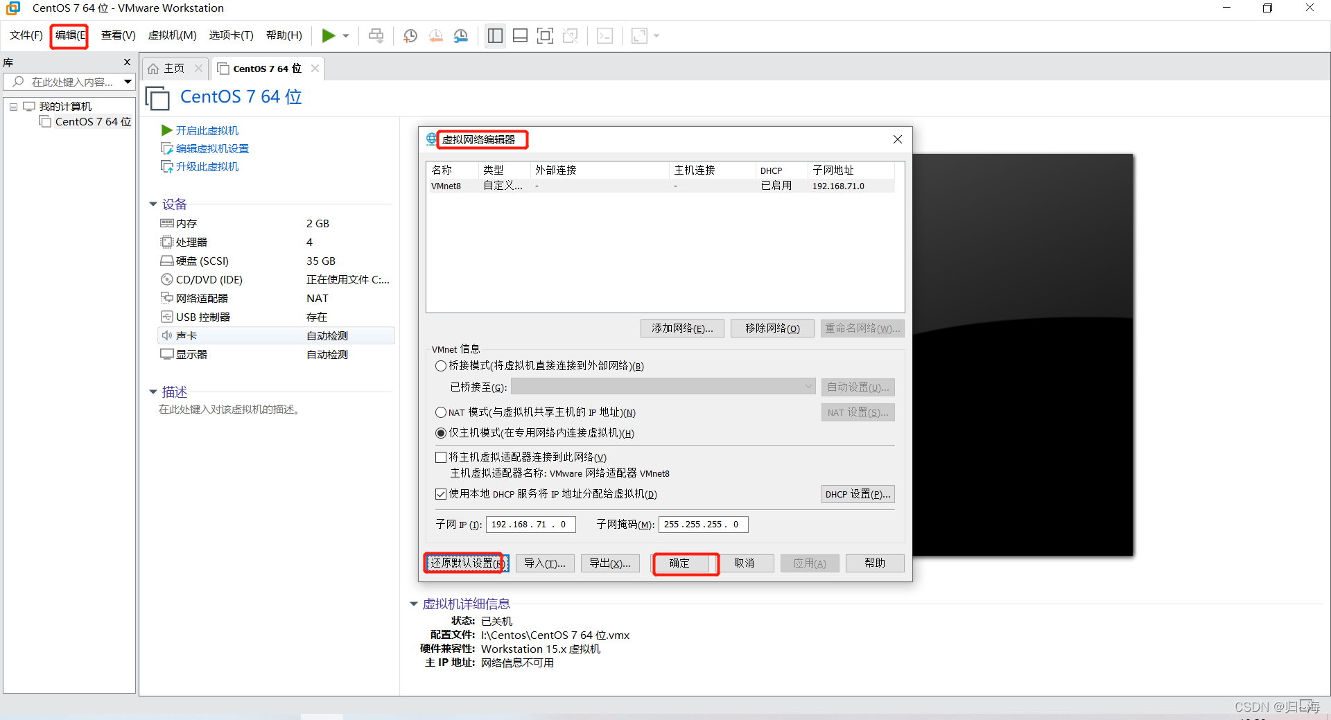 1)打开编辑找到虚拟网络编辑器点击还原默认设置
