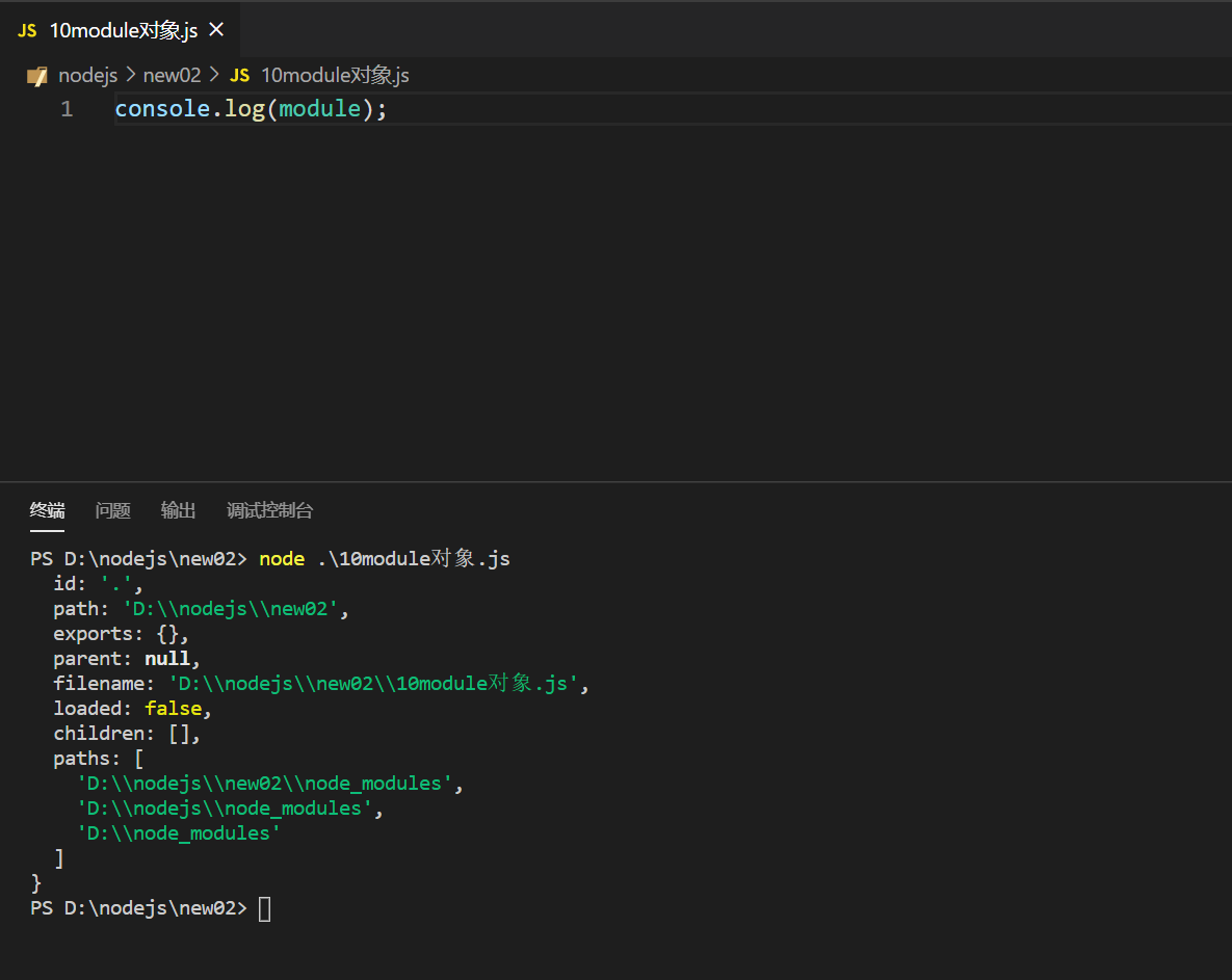 在每个 .js 自定义模块中都有一个 module 对象,它里面存储了和当前模块有关的信息,打印如下: