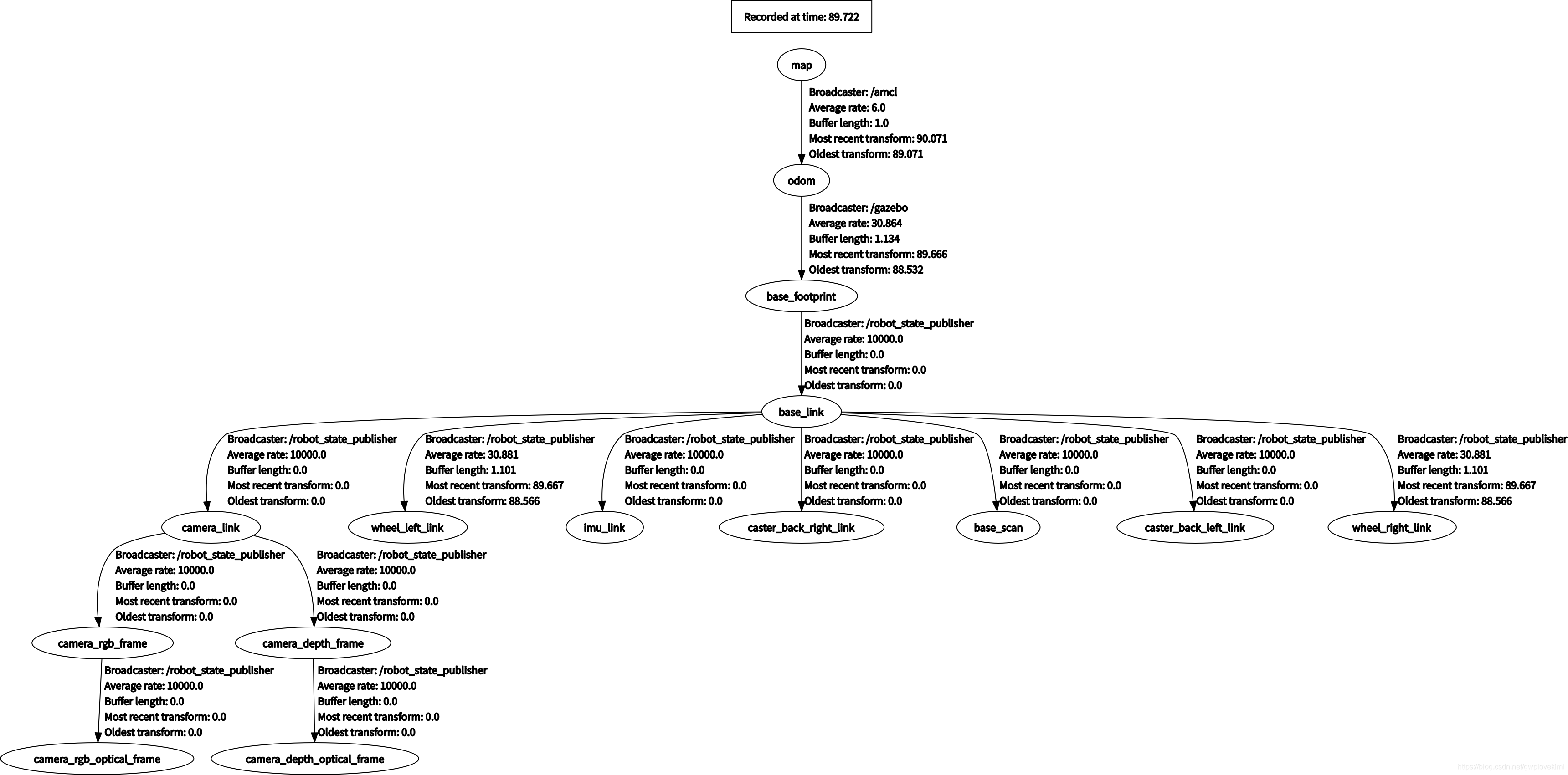 Vector3三维向量表示平移,Quaternion四元数表示旋转.像下图TF树中的两个frame之间的消息,就是由这种格式来定义的.odom就是frame_id,baselink_footprint就是child_frame_id.我们知道,一个topic上面,可能会有很多个node向上面发送消息。如图所示,不仅有我们看到的frame发送坐标变换个tf,还有别的frame也在同样的向它发送消息。最终,许多的TransformStamped.msg发向tf,形成了TF树。