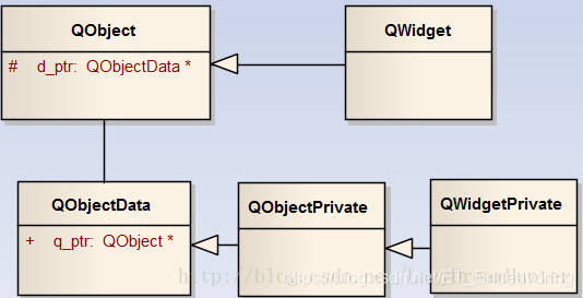 QObjec的子类,例如QWidget,将QWidgetPrivate*传给QObject的d_ptr。同理QObjectData的子类,例如QWidgetPrivate将QWidget*传给QObjectData的q_ptr。也就是是说着两个类继承树中,各自维护一个指向对方的指针。