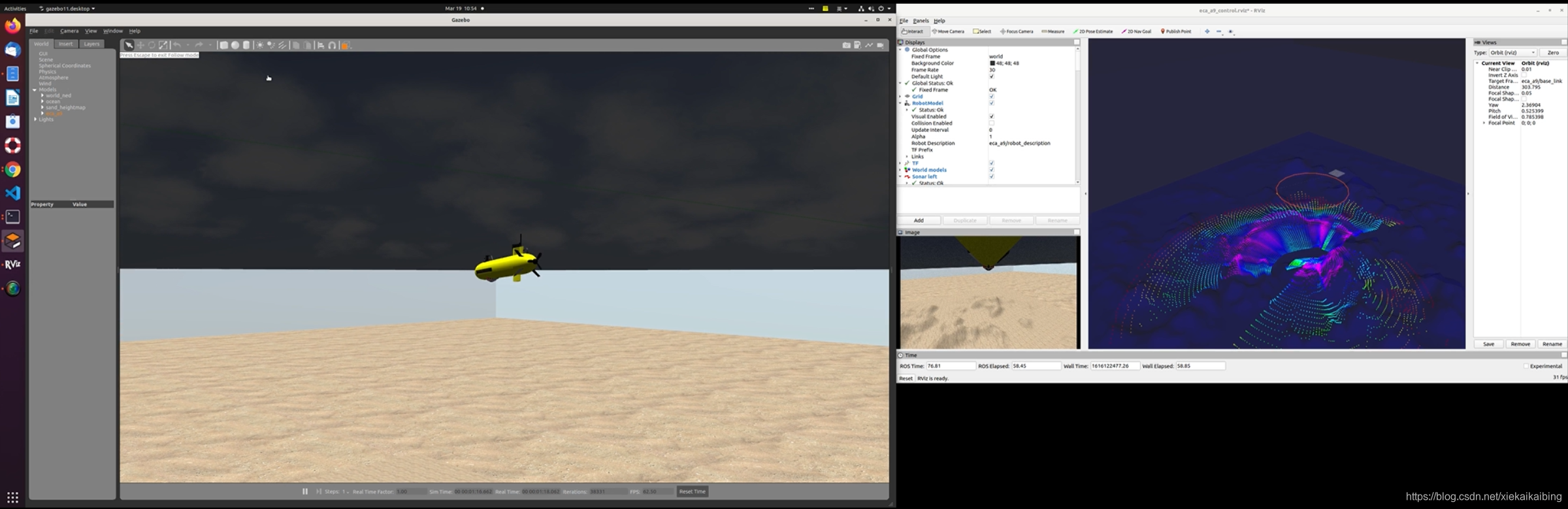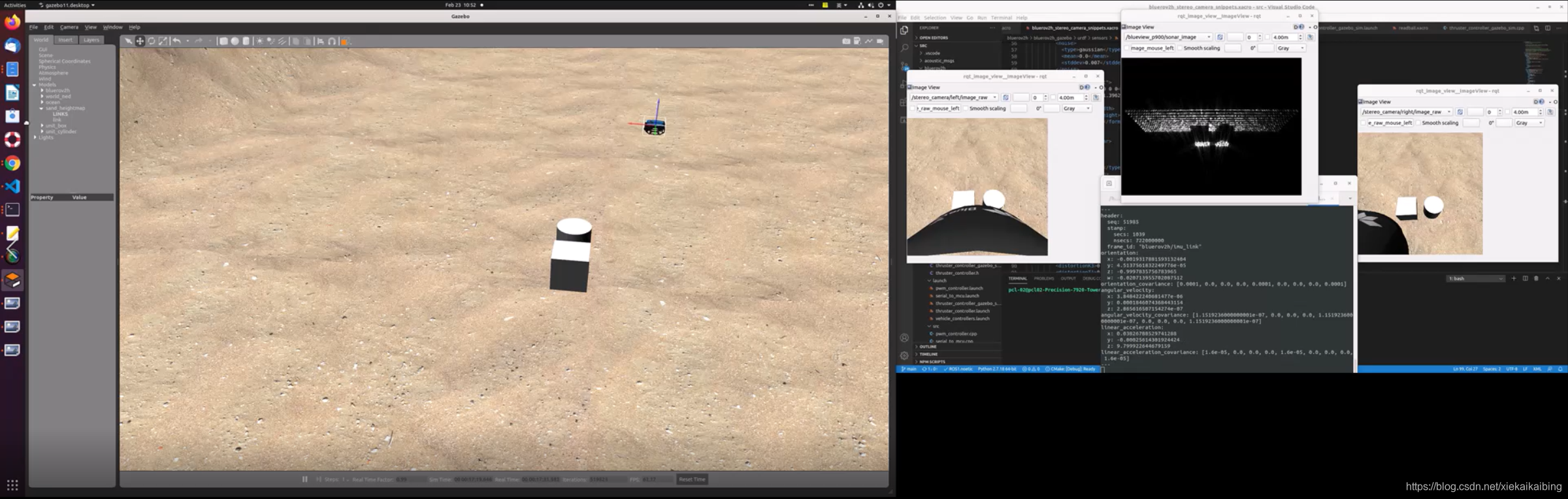 右边的屏幕输出的双目图像,前视图像和IMU的数据,同时是能获取前视声呐原始点阵数据的,便于算法的研究。同时gazebo里是能获取机器人在世界坐标系下的绝对位置,可以与算法解算出来的位置做比较,成为算法性能评估的一个依据。