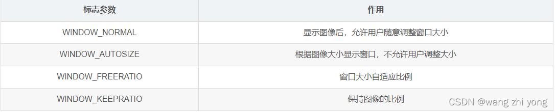 namedWindow(“输入窗口”, WINDOW_NORMAL); 其中”输入窗口”为显示窗口的名字;第二个参数是对窗口的大小、比例进行设置。具体意义如下表: