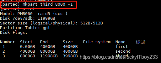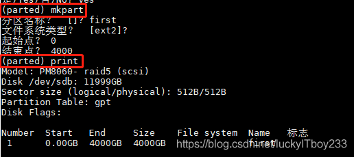 9)设置下一个分区,在(parted)中输入:“mkpart [name] [firstsize] [lastsize]”。