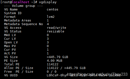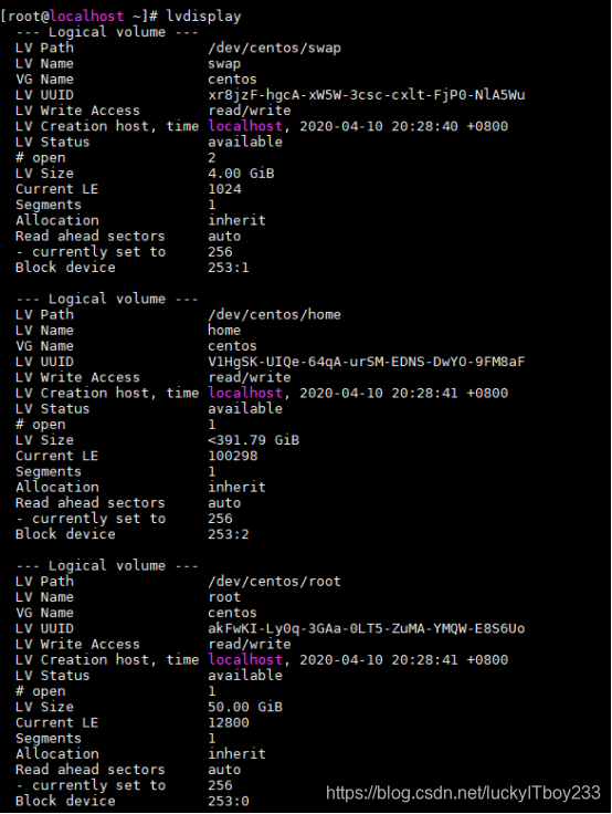 b)查看逻辑卷LV情况,输入命令:“lvdisplay”,发现root、home、swap的卷组都是centos。