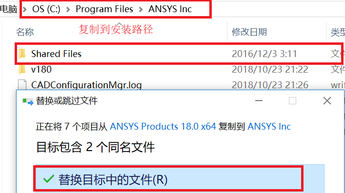 13.下面是破解。将安装包中的Shared Files文件夹复制到安装路径C:\Program Files\ANSYS Inc下,覆盖原文件夹。