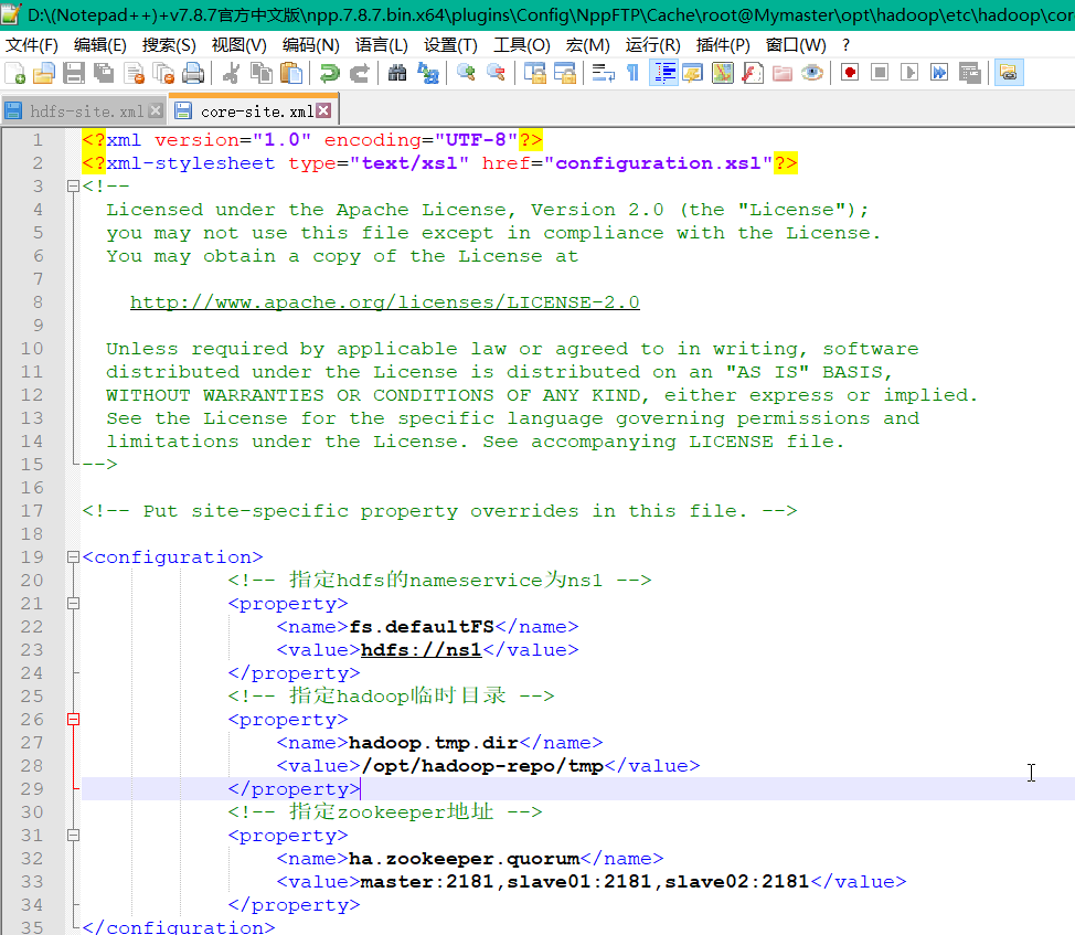 <!--指定hdfs的nameservice为ns1,需要和core-site.xml中的保持一致 -->