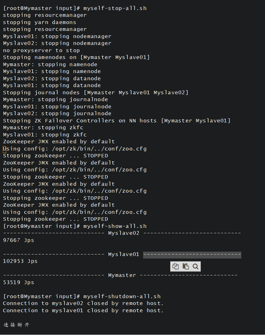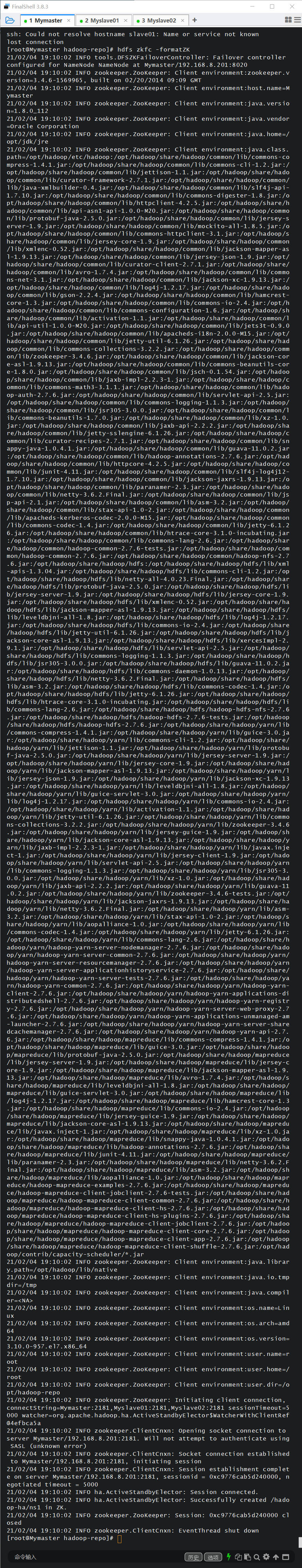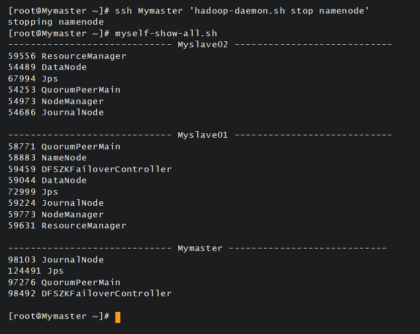 在NameNode进程所处的任何一台节点上格式化zkfc(此处选用Mymaster节点)
