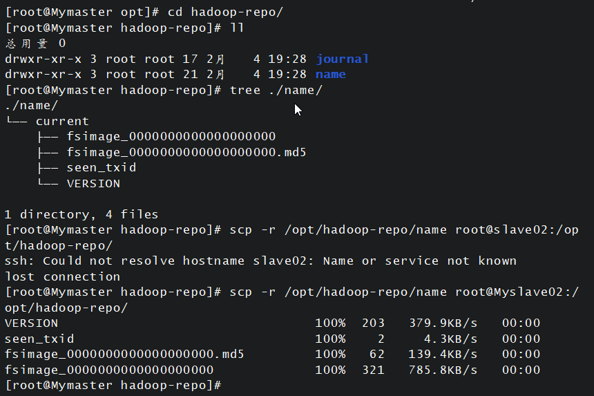 [root@Mymaster hadoop]# scp -r /opt/hadoop/ root@Myslave02:/opt/hadoop/
