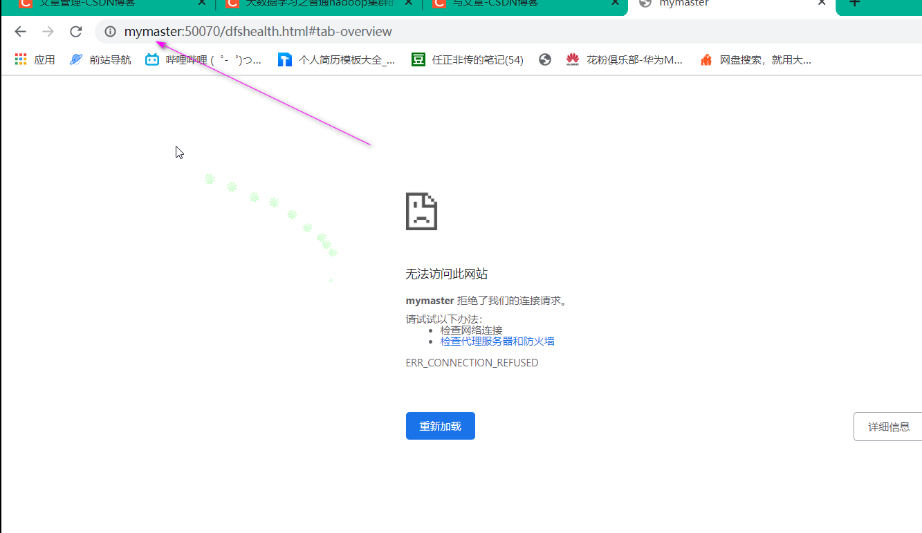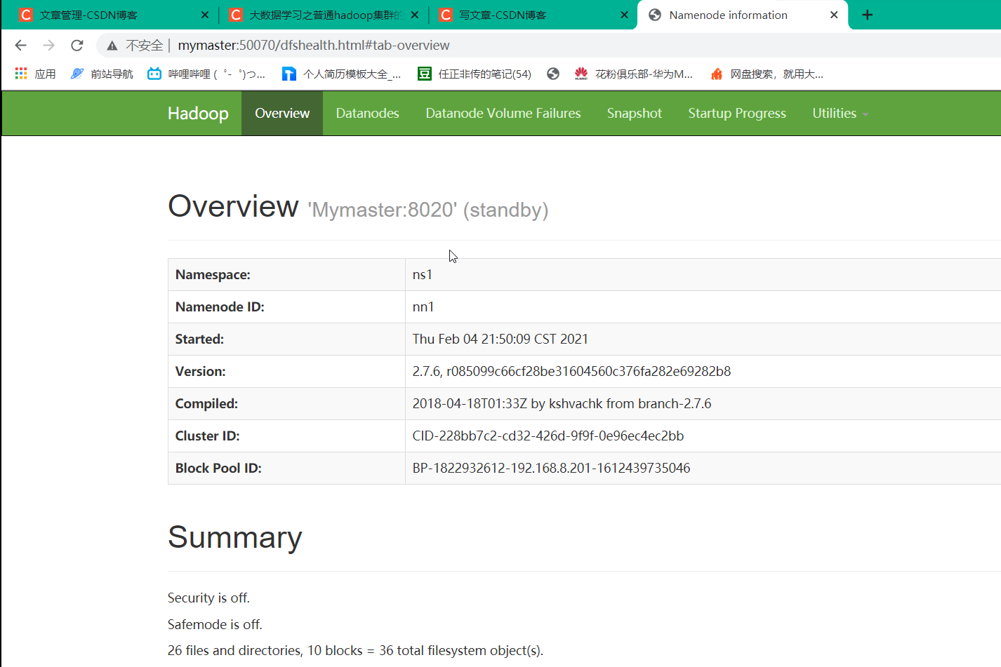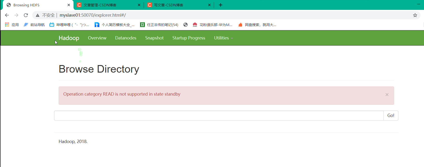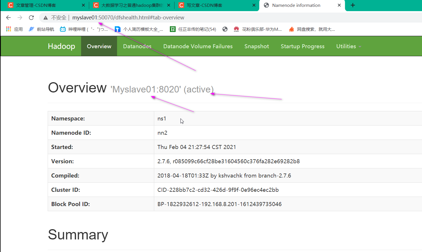 查看web情况可以看到我们的Myslave01的NameNode变成了active,master,通过http访问NameNode进程,会报错