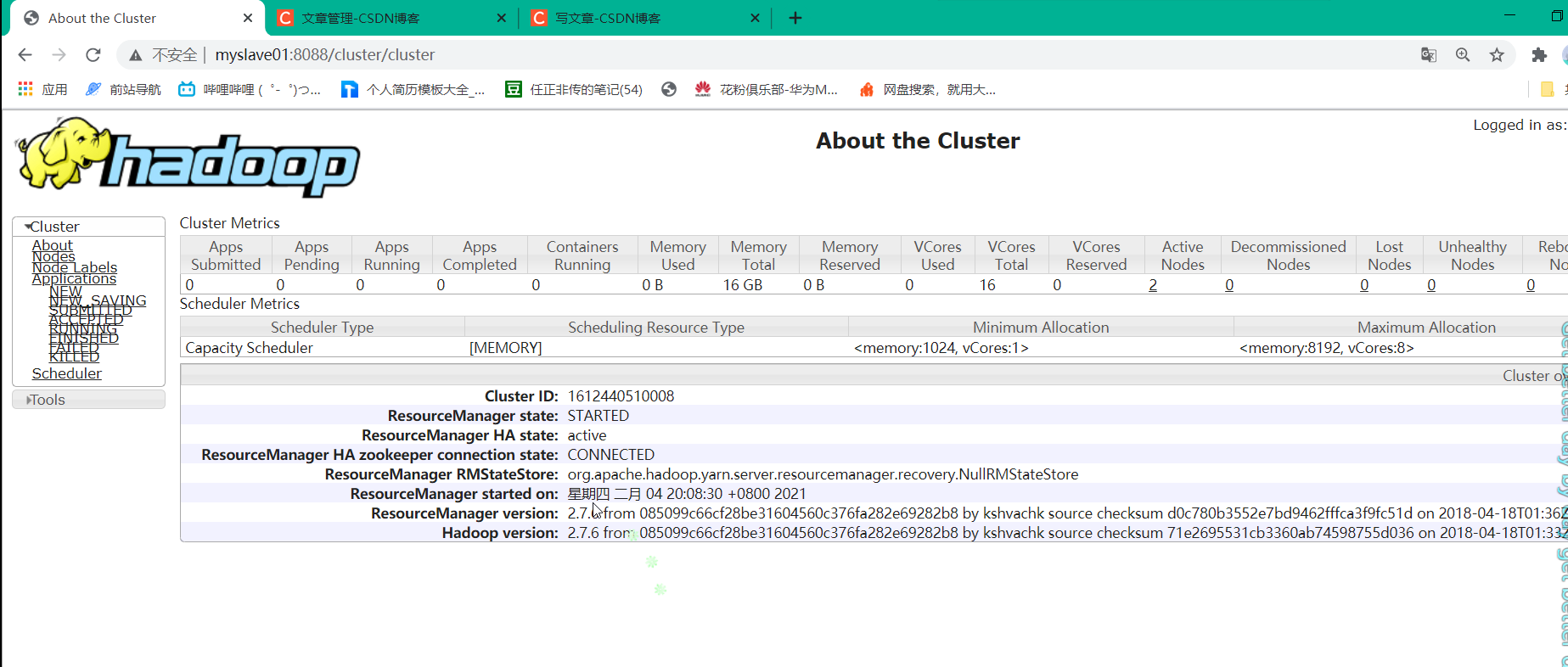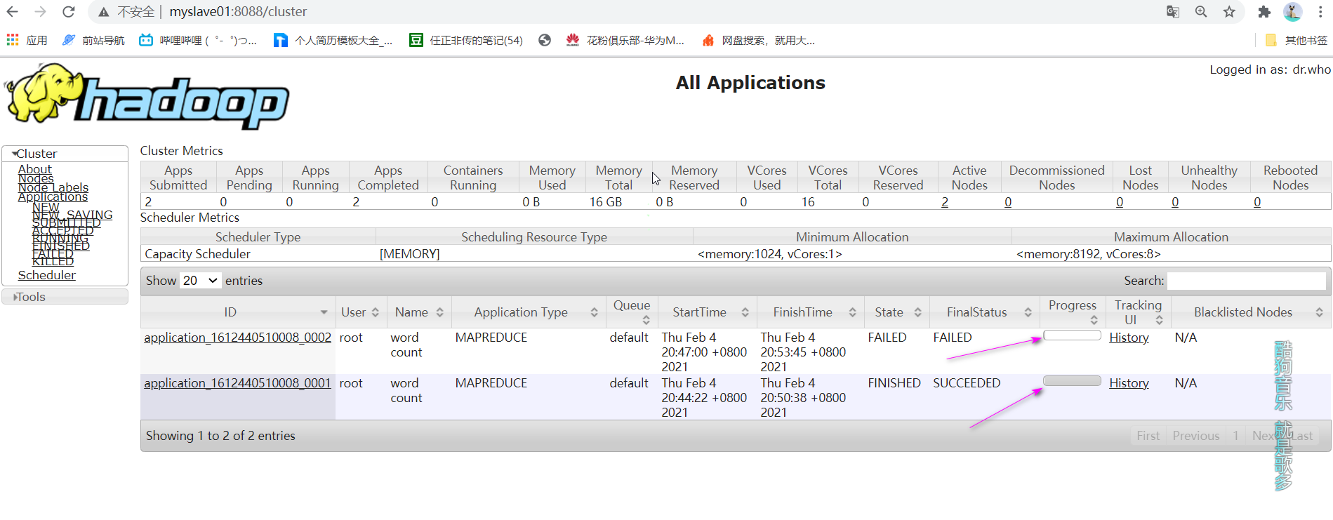 并且http://Myslave02:8088/ →自动跳转到active状态的ResourceManager节点上