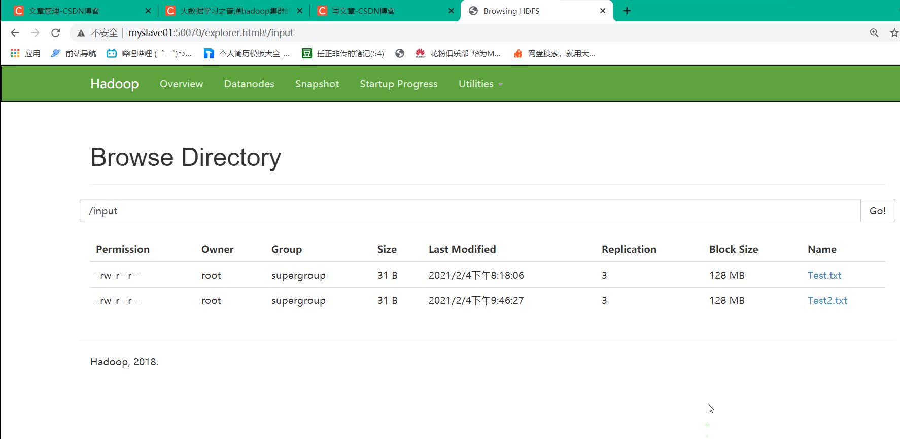 [root@Mymaster input]# yarn jar /opt/hadoop/share/hadoop/mapreduce/hadoop-mapreduce-examples-2.7.6.jar wordcount hdfs://Mymaster:8020/input hdfs://Mymaster:8020/output