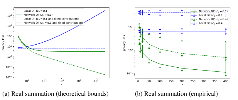 。我们的形式分析包括控制用户贡献的数量,以及使用集中不等式控制周期的大小,这导致了一些近似。然而,在实际部署中,可以使用这些数量的实际值来计算隐私损失。因此,我们研究了我们的理论隐私保障和通过运行随机walk的模拟可以在实践中获得的差距。具体来说,我们对大小为T = 100n的随机walk进行采样。然后,对每一对用户,根据实际行走的特点和高级组合机制计算隐私损失。我们在10次随机漫步中重复这个实验,然后我们可以报告在所有用户对和所有随机运行中观察到的平均、最好和最坏的隐私损失。图1b报告了基于高斯机制的真实求和情况下的经验结果,其中隐私以因子√m增长,其中m为元素聚集在一起的数量(即,我们观察到,网络DP实现的增益在实践中明显强于我们的理论边界保证(见图1a)。特别是,即使对于较小的n,增益也是显著的。这些结果再次表明,在我们的分析中还有改进的空间,例如诉诸于更好的集中界限。