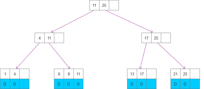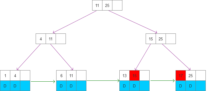 上图中删除关键字:21,由于删除后结点只有一个关键字:25<[M/2],因此需要从兄弟结点中借用一个关键字:17,删除后的结果如下: