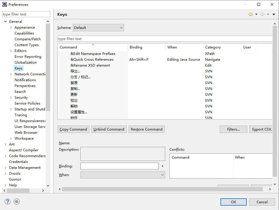 1、点击window菜单->preferences->general->keys,进入快捷键管理界面