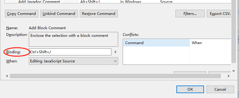 2、在这里可以查找所有功能的快捷键,需要修改或新增时,点击需要修改或新增的命令,在binding里设置快捷键