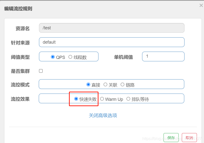 - controlBehavior:流控效果,0-快速失败,1-warm up,2-排队等待