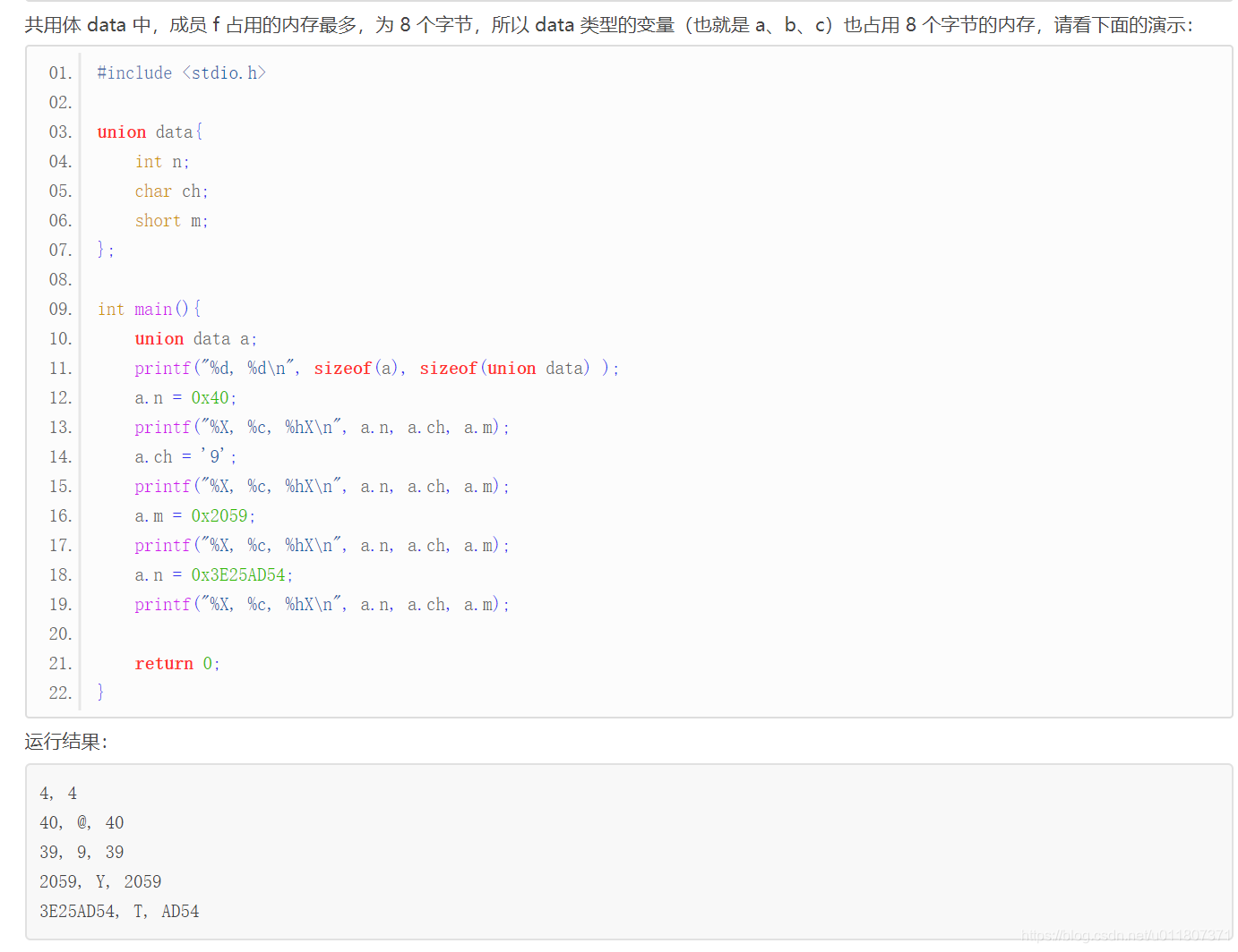 成员 n、ch、m 在内存中“对齐”到一头,对 ch 赋值修改的是前一个字节,对 m 赋值修改的是前两个字节,对 n 赋值修改的是全部字节。也就是说,ch、m 会影响到 n 的一部分数据,而 n 会影响到 ch、m 的全部数据。