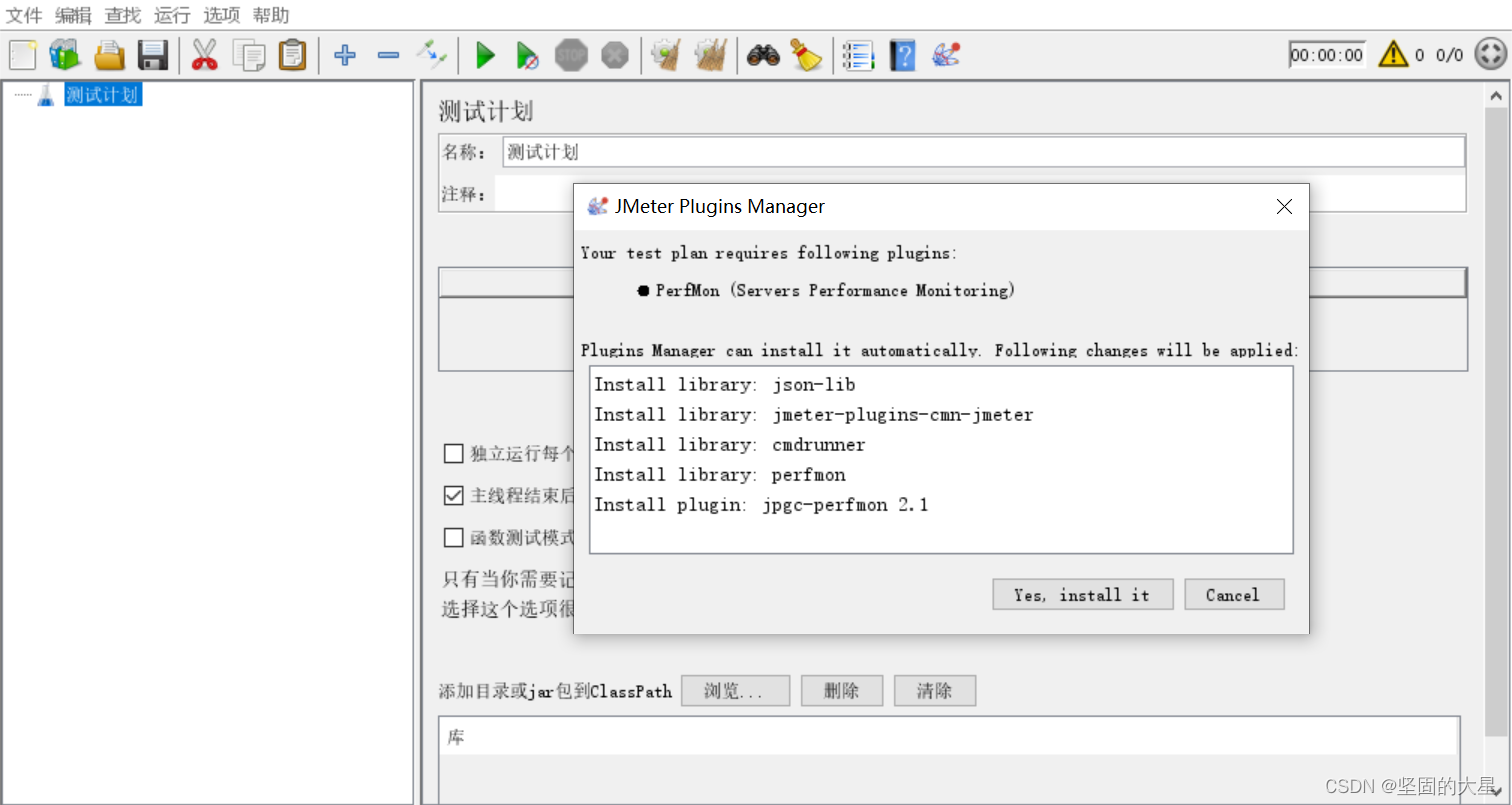重新打开jmeter和脚本,提示下载插件,点击YES