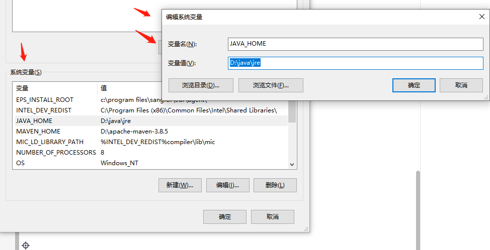 3.系统变量MAVEN_HOME、JAVA_HOME配置的变量值目录D:\apache-maven-3.8.5、D:\java\jdk,无论放在哪个文件夹下面请确保该目录下存在bin文件夹,不存在bin文件夹会导致配置错误