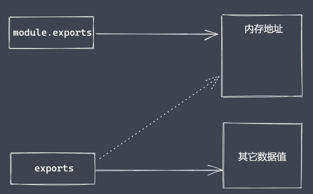 - 是nodejs为了方便,给每个模块加了一个exports指向module.exports的内存地址
