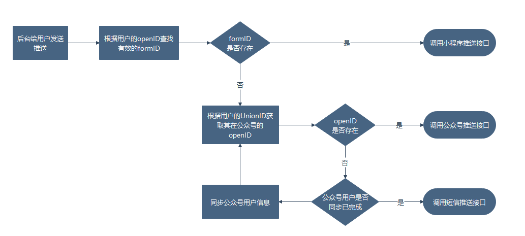 1、后台需要推送给用户A,那么先查找用户A对应的未过期的formID,如果找到直接通过小程序推送;如果找不到,或formID已经过期,则继续后续步骤,通过公众号推送。