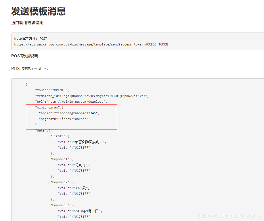 红框里的appid指定跳到哪个小程序,pagepath则指定了展示的页面。接口具体地址: