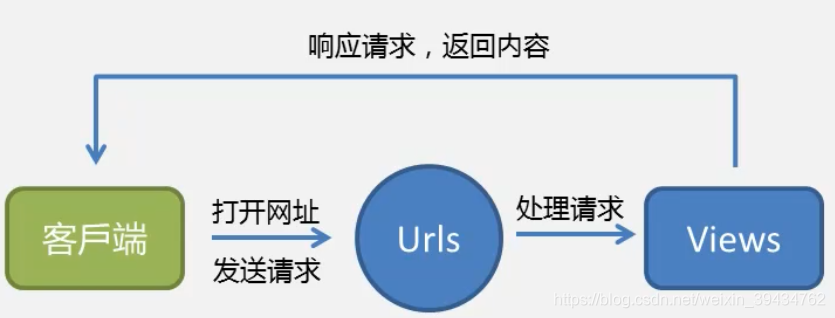 客户端发出请求——>Urls判断网址合法性和访问方式——>处理请求返回View内容