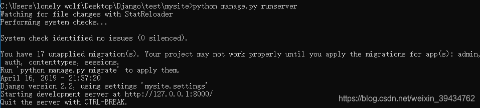 但是我们并没有设置用户名和密码,所以我们先用Ctrl+c结束本地服务;然后在cmd命令窗口下对数据库初始化(因为要存贮信息嘛)。如果忘了同步数据库命令(当我们启动本地服务时数据库已经初始化了)。当你启动本地服务时,它会提示你用下列命令行初始化,所以不慌。