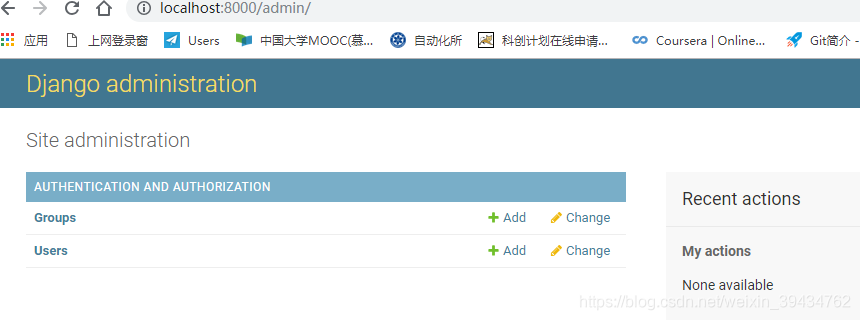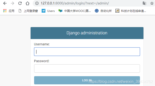 是Django后台管理的一个网址,我们尝试一下,先运行本地服务,然后输入http://127.0.0.1:8000/admin/,我们会进入Django后台管界面: