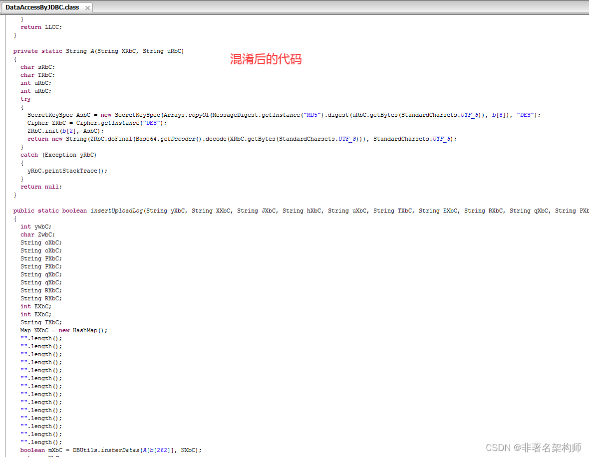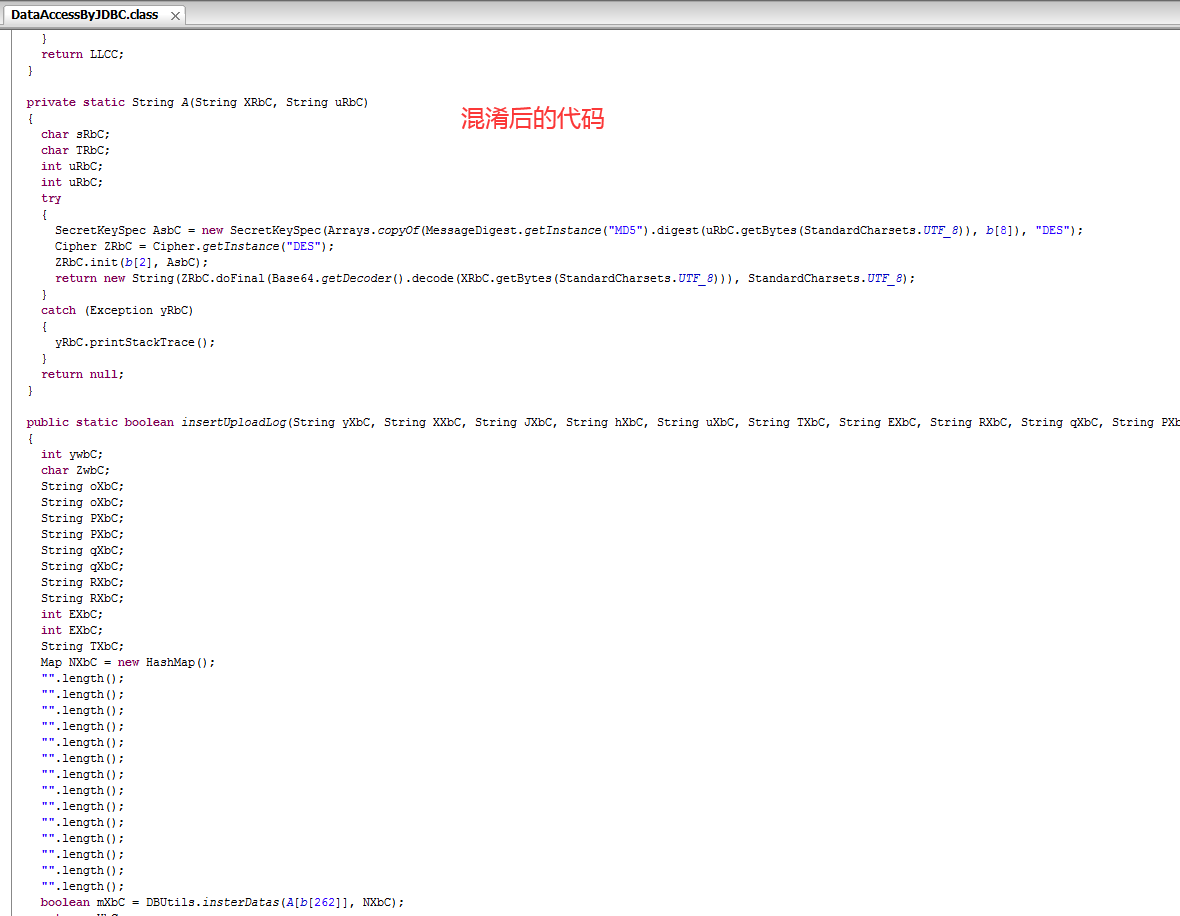 2、使用花指令,使得class文件不能反编译(利用反编译工具漏洞);安全性一般,还是有花指令破解器;