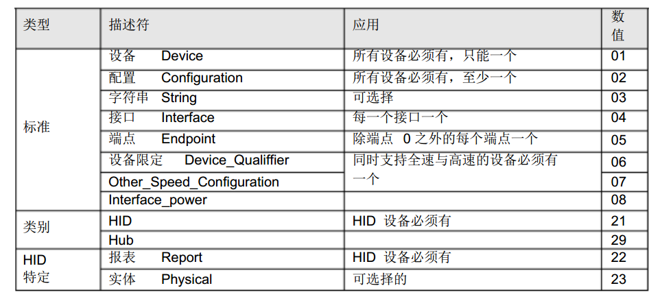 bDescriptorType代表了本描述符的类型,设备描述符为0x01。所有的描述符类型表示如下图,大家以后也可以速查: