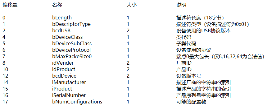 数组,设备描述符的长度是18字节,下面我们来学习设备描述符数据结构,看看USB设备具有哪些特征,它的结构我们可以通过下面的表格来逐一了解。