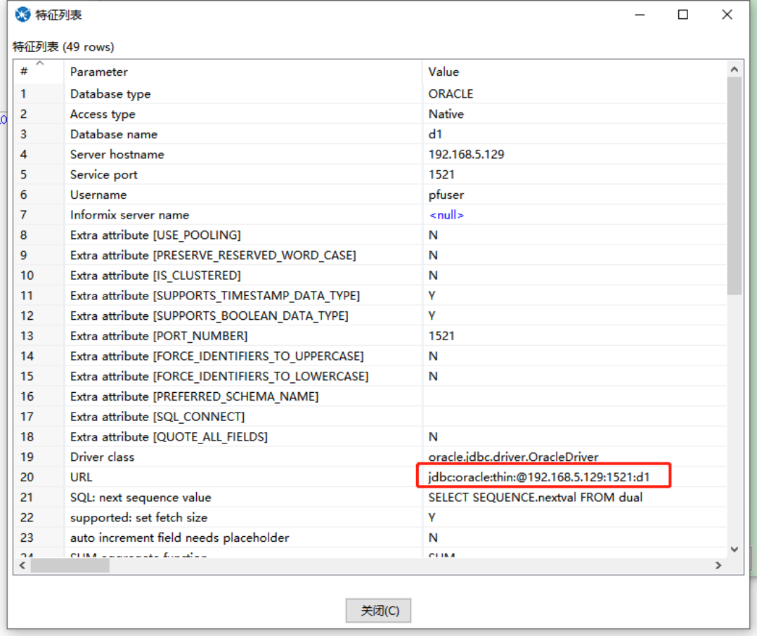 默认情况下,在kettle数据库连接中配置连接后,查看特征列表,发现实际的URL地址如下: