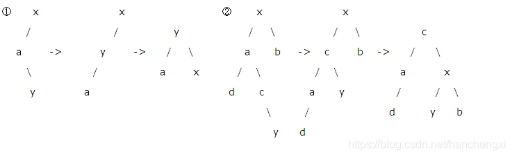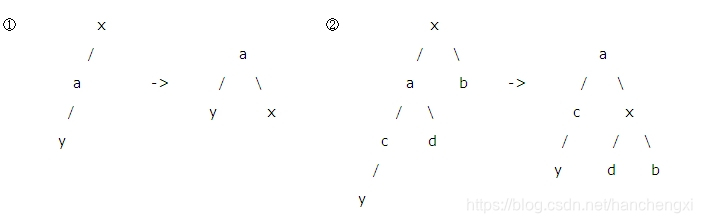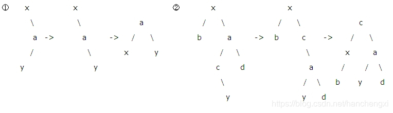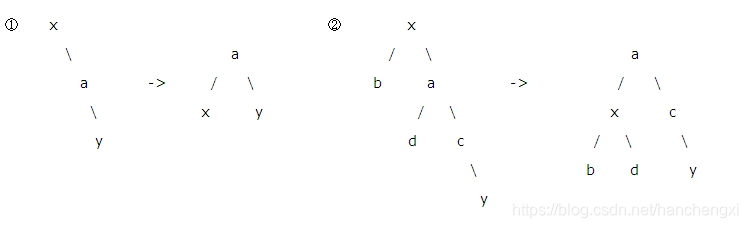 即在x的左孩子a的右孩子c上插入一个结点y(该结点也可以是c,如图①),即y可以是c,也可以是c的右孩子(如图②),也可以是c的左孩子(不在画出)