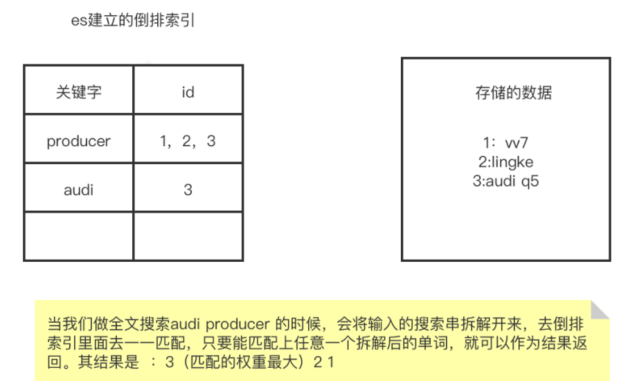 结果三个都能查询到,因为全文检索会将输入的搜索串拆解开来,去倒排索引里面去一一匹配,只要能匹配上任意一个拆解后的单词,就可以作为结果返回。