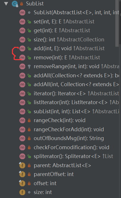 该类是AbstractList的子类,即也是List的实现类,它实现了add/remove方法,故我们可以调用它的add/remove方法。**但是:**它的add与remove的实现逻辑与ArrayList并不相同,从上面的测试例子以及源码描述可以可看出返回的SubList与父List共用底层的同一个存储数组,所以修改SubList的结构,父List的结构也会发生改变。
