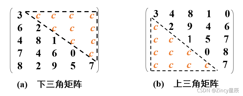 矩阵中很多值相同的元素并且它们的分布有一定的规律:对称矩阵、三角矩阵、对角矩阵