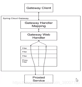 客户端向Spring Cloud Gateway发出请求,然后在Gateway Hander Mapping中找到与请求相匹配的路由,将其发送到Gateway Web Handler。
