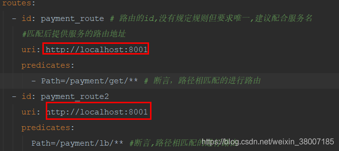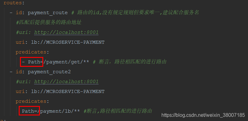 然后在我们的YML的配置文件也可以看到路由配置,我们使用的是path,就是请求的Path(路径)匹配配置值。如下图: