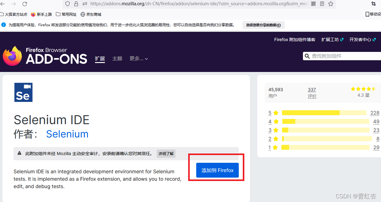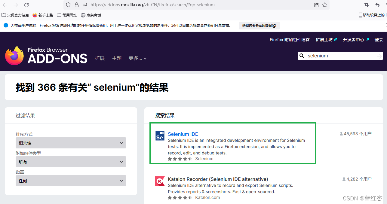 本文以firefox浏览器为例说明 selenium IDE 插件的安装。(查看谷歌浏览器安装selenium IDE插件的