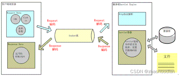 用户从浏览器端发起一个 HTTP 请求,需要存在编码的地方是 URL、Cookie、Parameter。服务器端接受到 HTTP 请求后要解析 HTTP 协议,其中 URI、Cookie 和 POST 表单参数需要解码,服务器端可能还需要读取数据库中的数据,本地或网络中其它地方的文本文件,这些数据都可能存在编码问题,当 Servlet 处理完所有请求的数据后,需要将这些数据再编码通过 Socket 发送到用户请求的浏览器里,再经过浏览器解码成为文本。这些过程如下图所示: