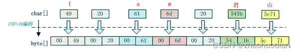 Java 中还有一个 ByteBuffer 类,它提供一种 char 和 byte 之间的软转换,它们之间转换不需要编码与解码,只是把一个 16bit 的 char 格式,拆分成为 2 个 8bit 的 byte 表示,它们的实际值并没有被修改,仅仅是数据的类型做了转换。如下代码所以: