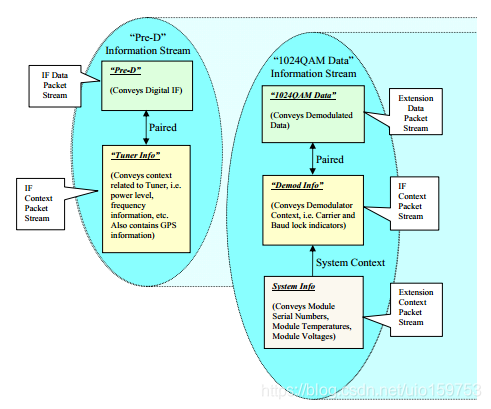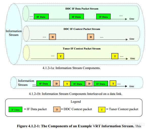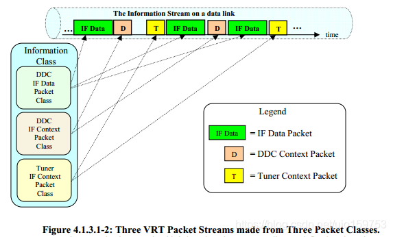 即VRT信息流是数据包流的合集。例如:其中的一个packet stream可能是数字化的采样数据,而与它在一块packet stream可能传递的是 RF 中心频点,带宽,功率,天线方向等。